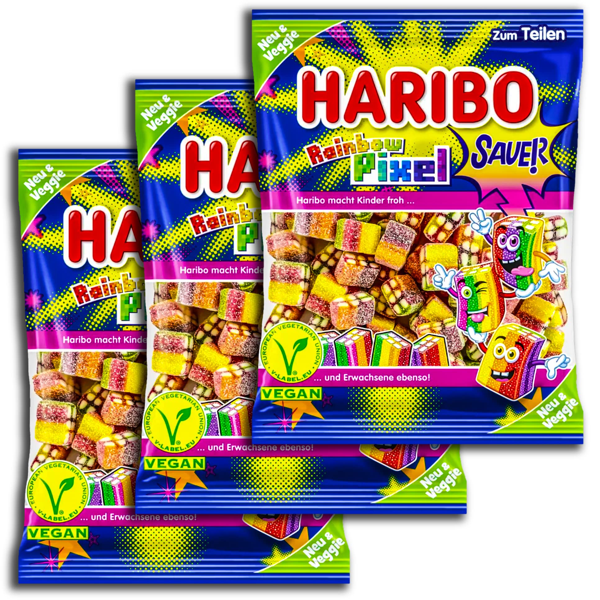 Haribo Rainbow Pixel Veggie, friandises fruitées multicolores en cubes.